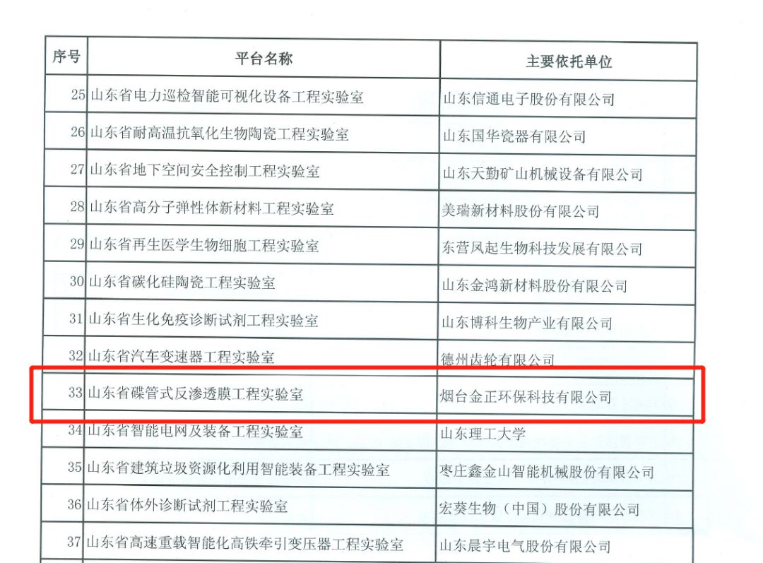 8月27日,山東省發展和改革委員會(以下簡稱省發改委)發布《山東省發展和改革委員會關于發布2018年認定山東省工程實驗室(工程研究中心)名單的通知》(魯發改高技〔2018〕937號),煙臺金正環保科技有限公司申報的“山東省碟管式反滲透膜工程實驗室”榮獲認定。
